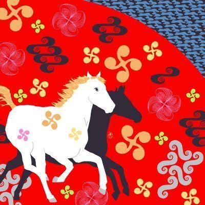 「令和八年(2026年) 午年の干支風呂敷。秋田の伝統工芸品、イタヤ馬柄の風呂敷。おせち2段重のお包みにぴったり。贈り物に最適。」